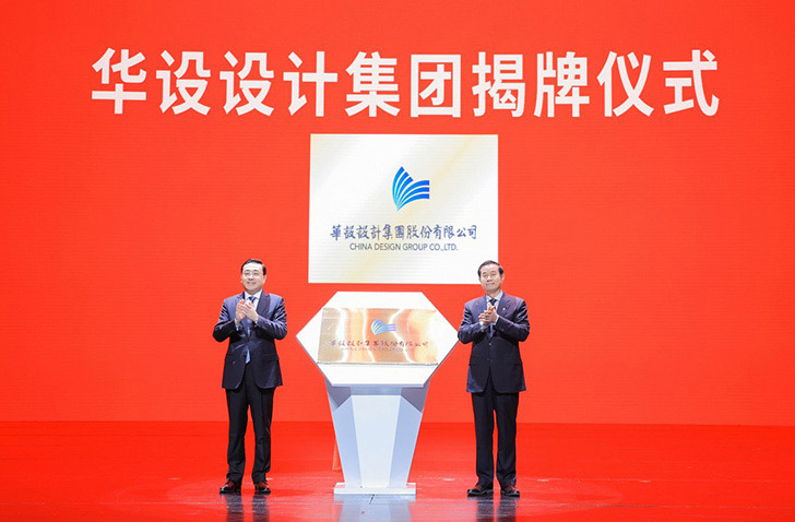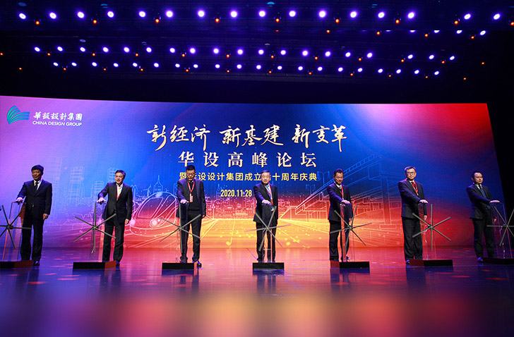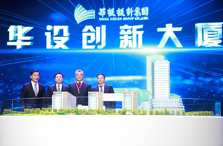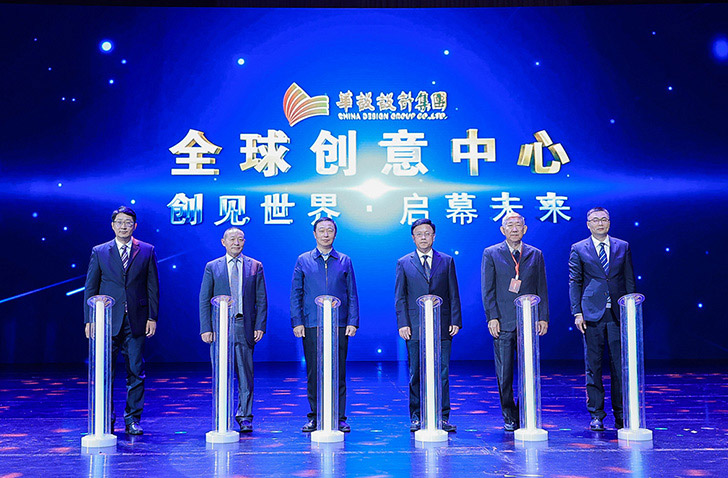 江苏省住房和城乡建设厅党组书记、副厅长顾小平、江苏省综合交通运输学会副理事长江里程、中国勘察设计协会理事长施设、中国水运建设行业协会常务副理事长徐光、华设设计集团董事、副总裁徐一岗、副总裁翟剑峰为华设全球创意中心揭牌