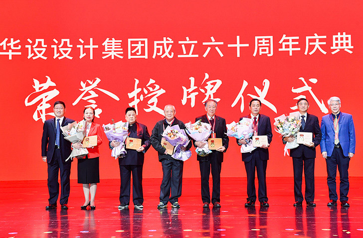 江苏省政协经济委员会主任、江苏省综合交通运输学会副理事长游庆仲、华设设计集团董事、副总裁凌九忠为蔡家范、周世忠、丁军华、李益芝、缪玉玲、邱桂松等六位华设集团老领导颁发荣誉奖牌